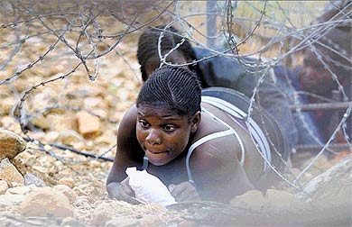Zimbabwe refugees crossing over to South African border into the Limpopo Province. Some get caught and sent back only to try again. They face an uncertain life in South Africa. In this photo a pregnant woman scrambles under a barbed wire fence near Beit Bridge on 31 March 2007. She was one of a group of 20 Zimbabweans making their way to South Africa. Their next step was to brave their way across the flooded Limpopo River. Photo by James Oatway.